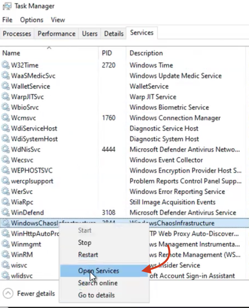 1. To resolve this, navigate to Task Manager from your command prompt (run as admin) and right click WindowsChaosInfrastructure and click Open Services.