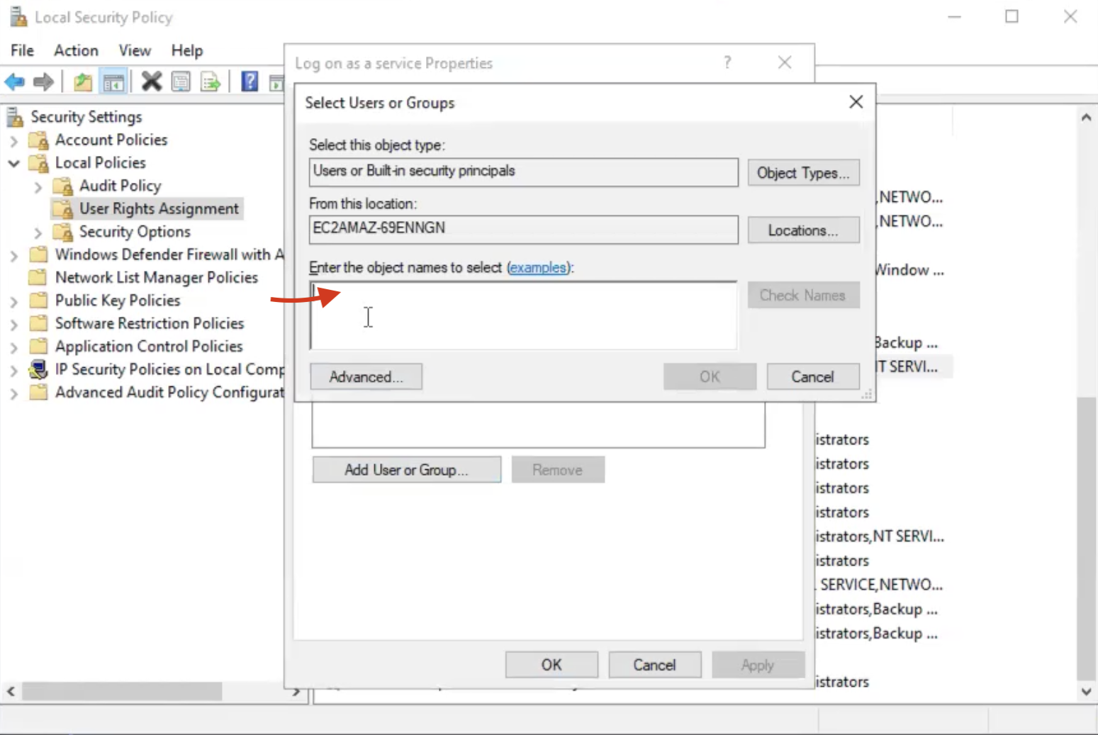 1. To verify this, navigate to Local security policy -> Local Policies -> User Rights Agreement -> Log on as a service.