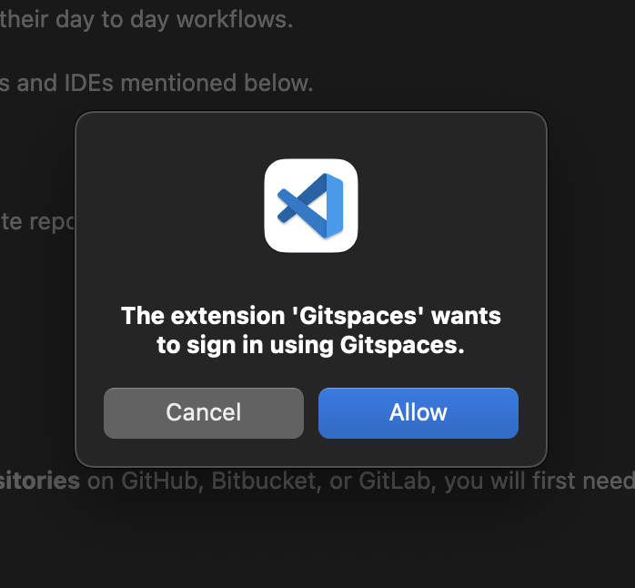 1. A dialog will appear asking to open your browser for Gitspaces authentication. Click “Allow” and “Open” to proceed.