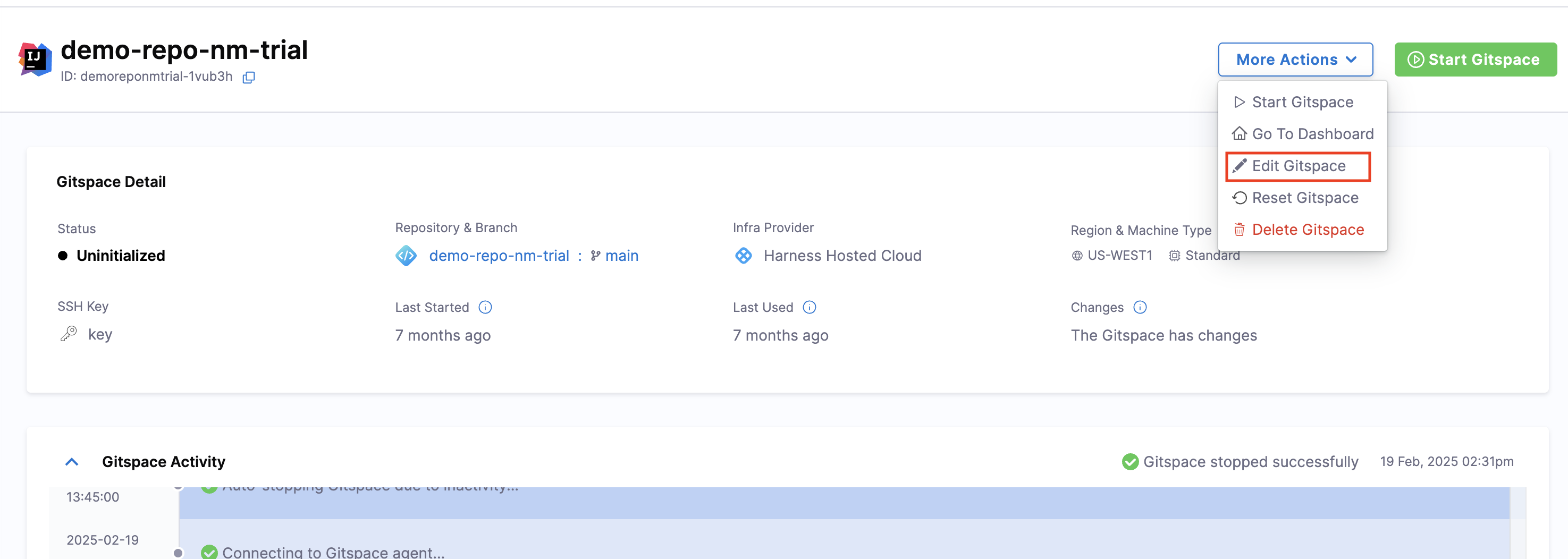 • Gitspace Details: Click on the More Actions menu of your Gitspace and click on Edit Gitspace.