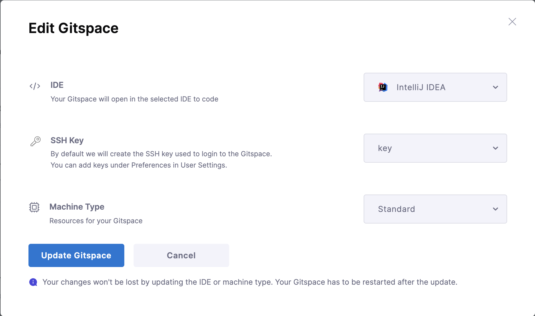 • SSH Key: You can update the SSH key of your Gitspace to a new key. This allows you to change and update the remote access credentials to your Gitspace accordingly.