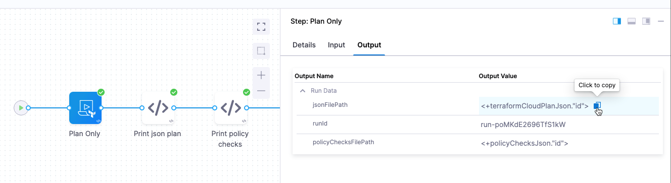 The expressions can be copied from the Terraform Cloud Run step's Output tab when the Run Type is Plan or Plan Only.