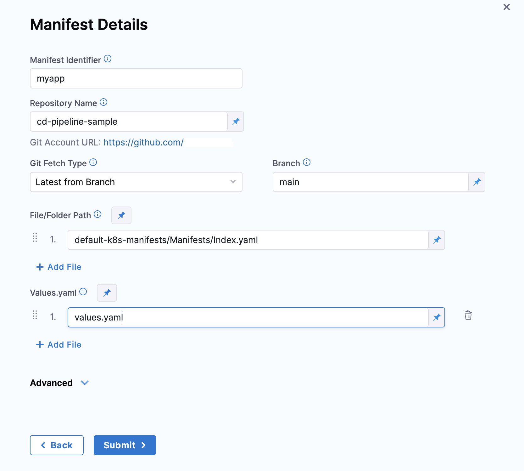 • Different repos: If the Values YAML are in a repo separate from your Kubernetes manifests or Helm Charts, or you just want to add them separately, you can them by selecting the Values YAML manifest type.