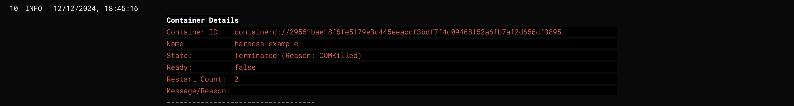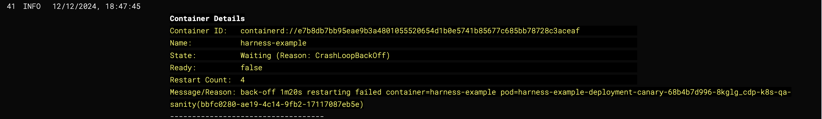 • The log output visually represents the status of the pods and container using color codes. Below is an example of how the container statuses appear in the logs.
