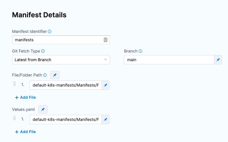 Watch a short video Here's a quick video showing you how to add manifests and Values YAML files in Harness. It covers Kubernetes as well as other types like Helm Charts.