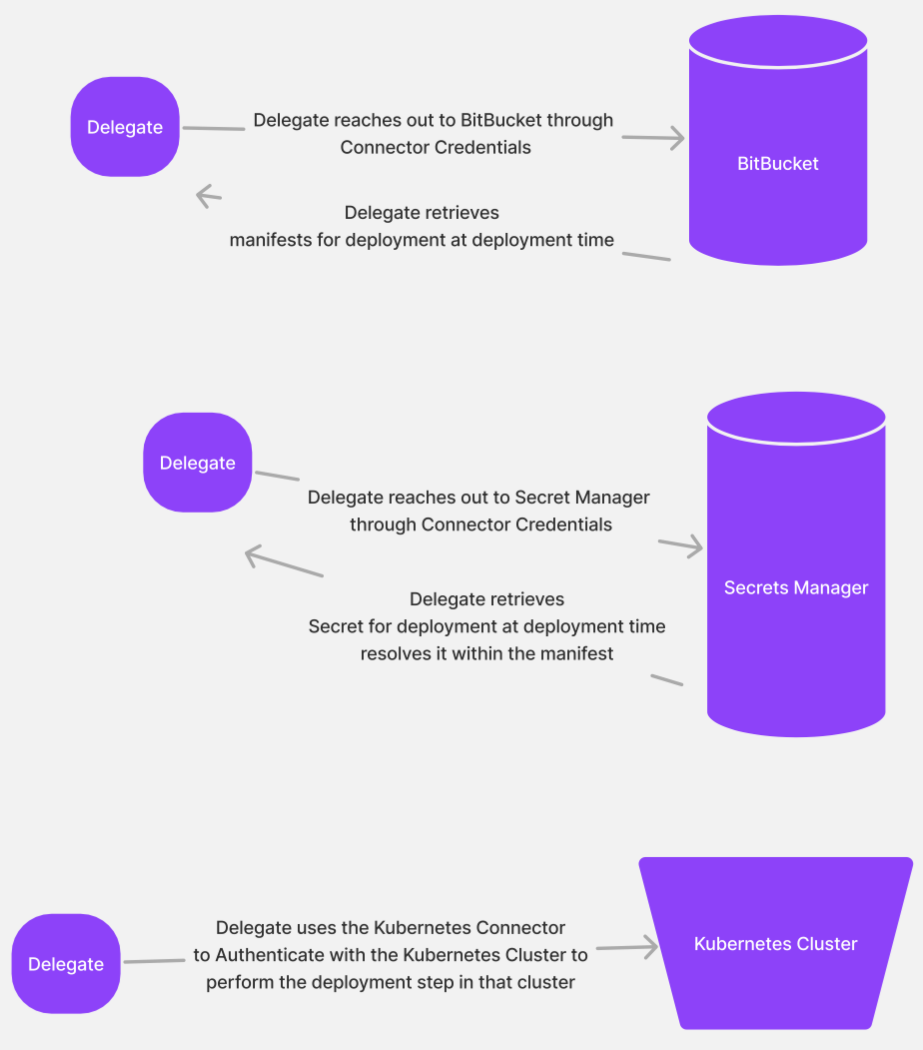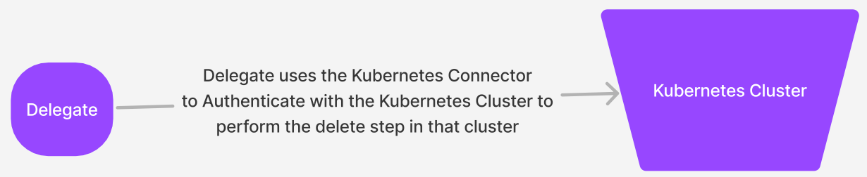 During execution of the Kubernetes Delete step, Harness selects the delegate that has access to the infrastructure definition connector and performs the Kubernetes delete step within that cluster.