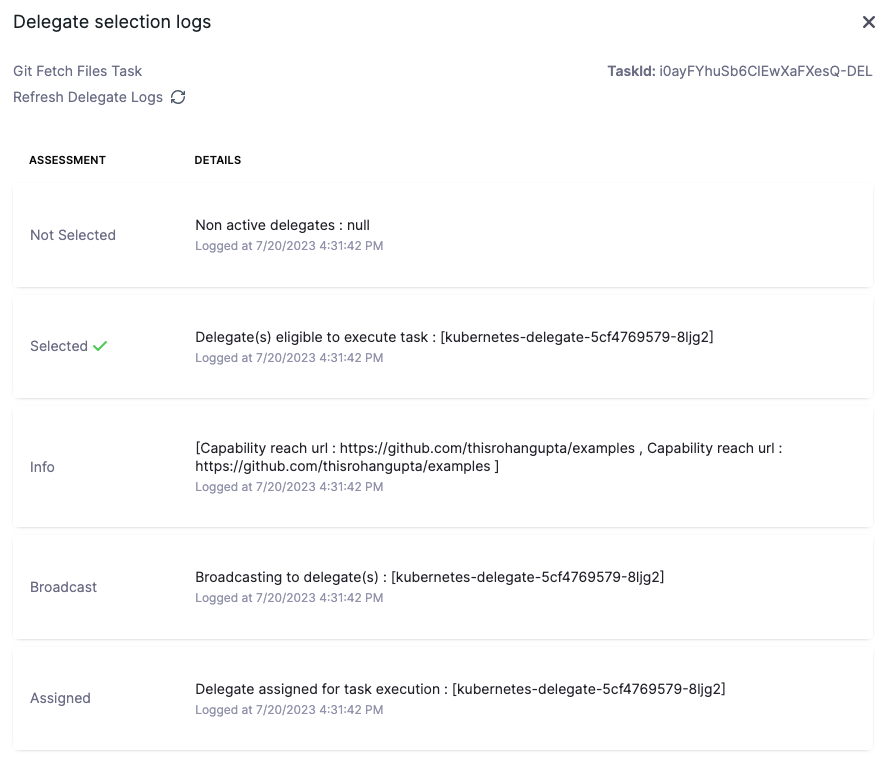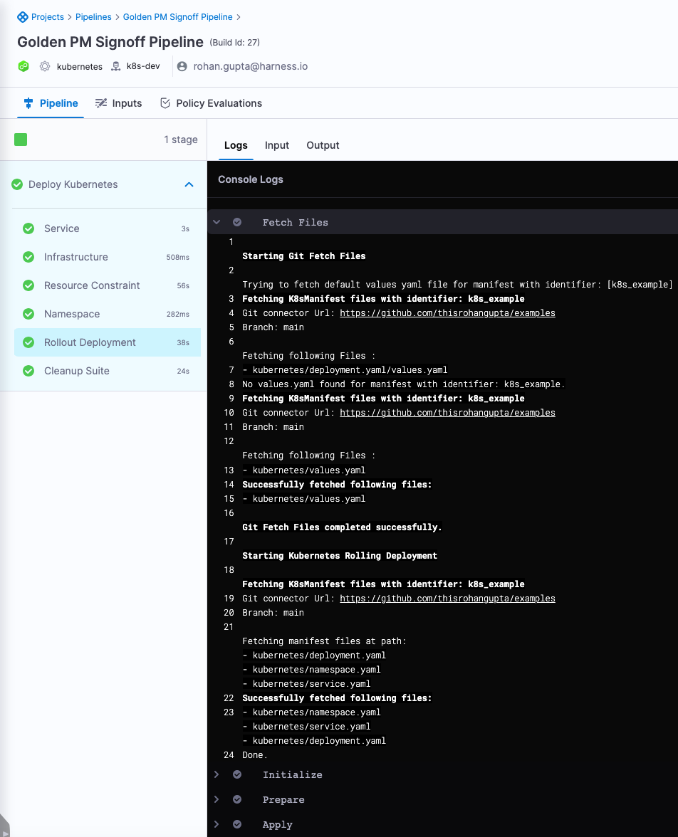 1. The fetch files task leverages the GitHub connector configured in the service to fetch the manifests.
