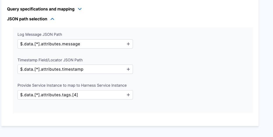 1. In Log Message JSON path, click the plus icon to select the path to the log message from the data source. For example,$.data.[*].attributes.message.