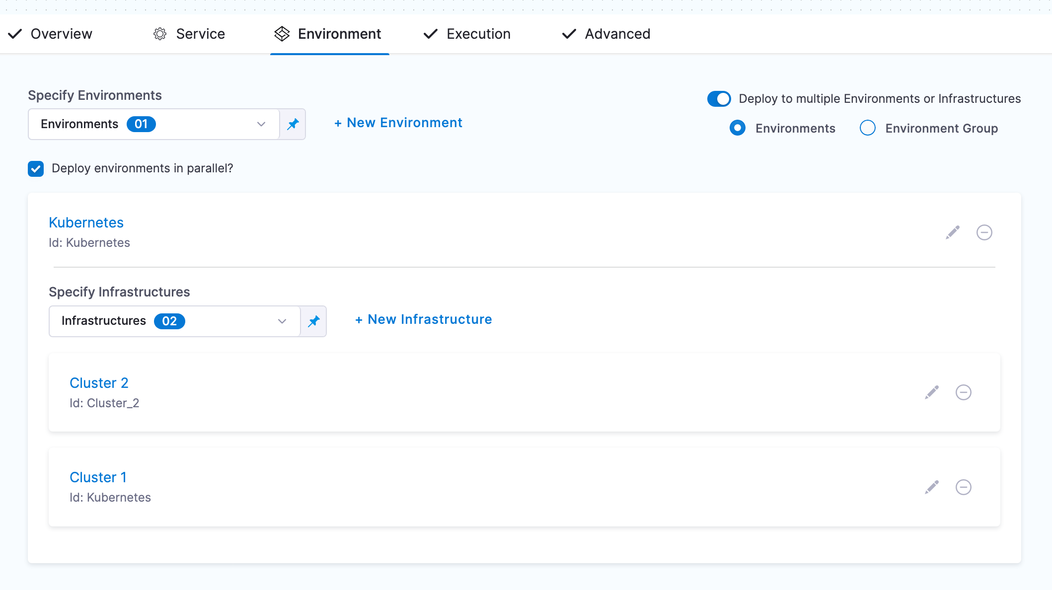 In Environments, enable Deploy to multiple Environments or Infrastructures. You can select one or more environments, and then one or more infrastructures in each environment.