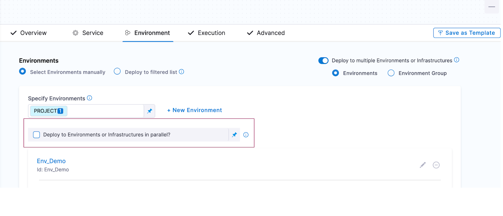 When you click on Deploy to multiple Environments or Infrastructures you see an option for Deploy to Environments or Infrastructures in Parallel. When you check that it will allow you to deploy your infrastructure and environment in parallel.