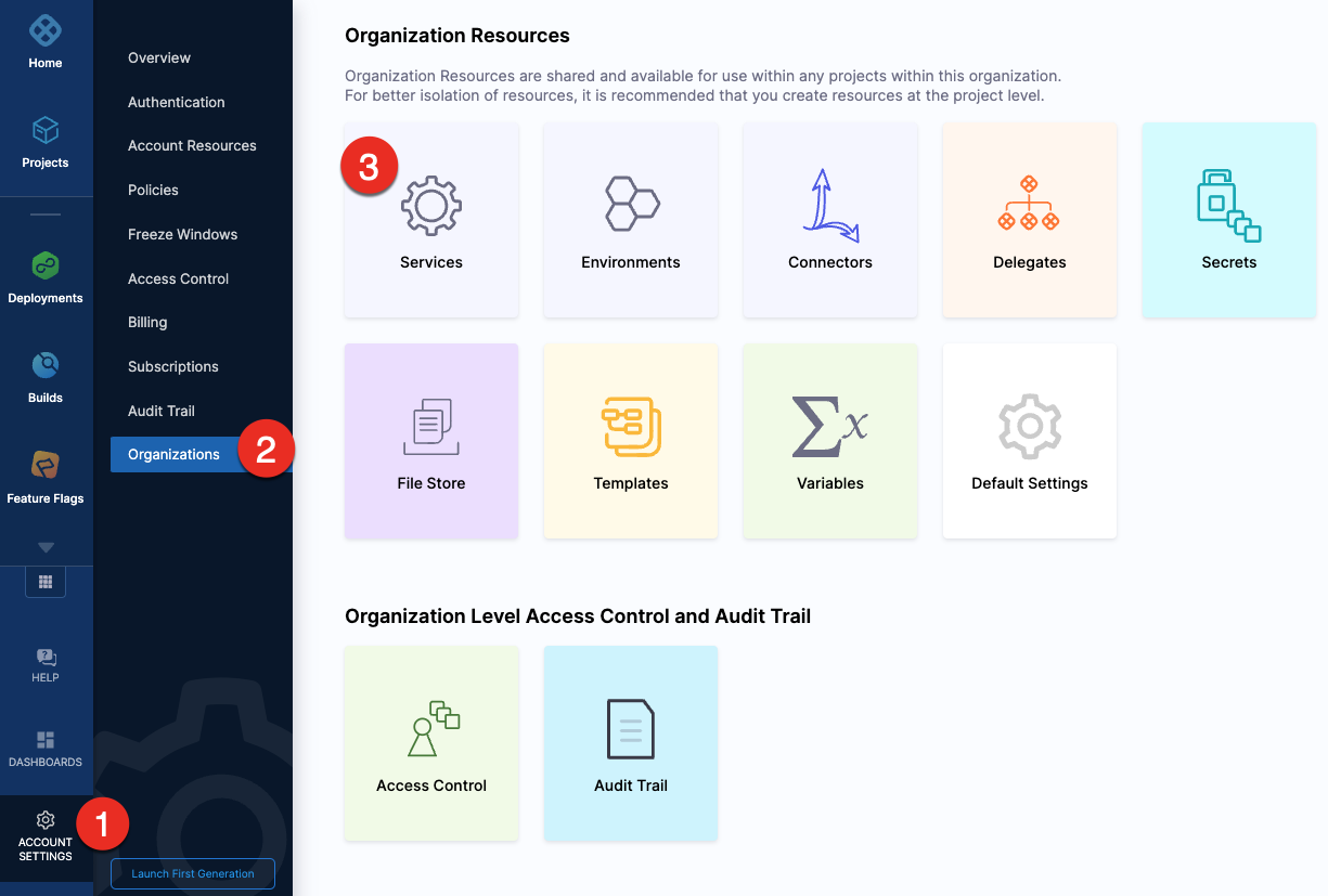 Services represent your microservices and other workloads. Each service contains a Service Definition that defines your deployment artifacts, manifests or specifications, configuration files, and service-specific variables.