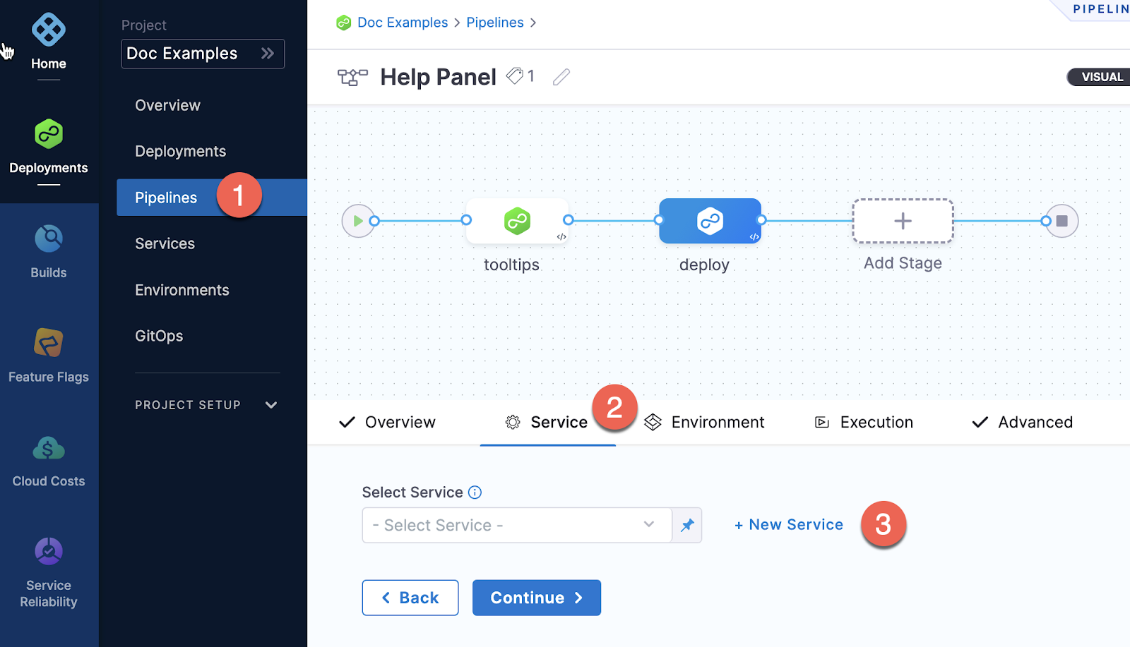 To create a service from inside of a pipeline, select the Services tab of a new CD stage, then select New Service.