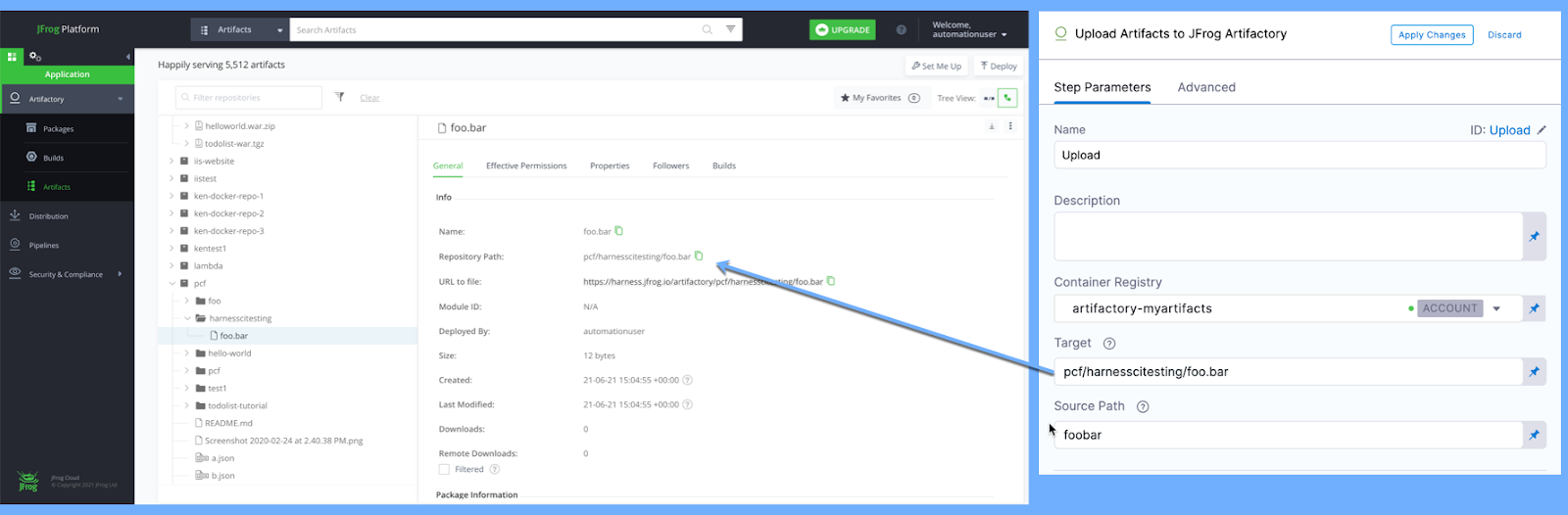If the Upload Artifacts step succeeds, you can find the artifact in your JFrog repo.