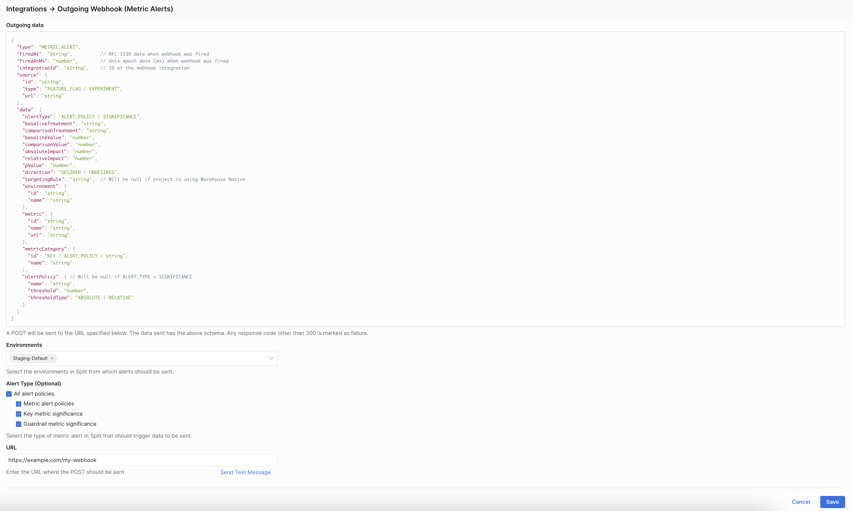 When a metric alert is triggered, Harness FME sends a POST request to the specified webhook URL with the following payload schema: