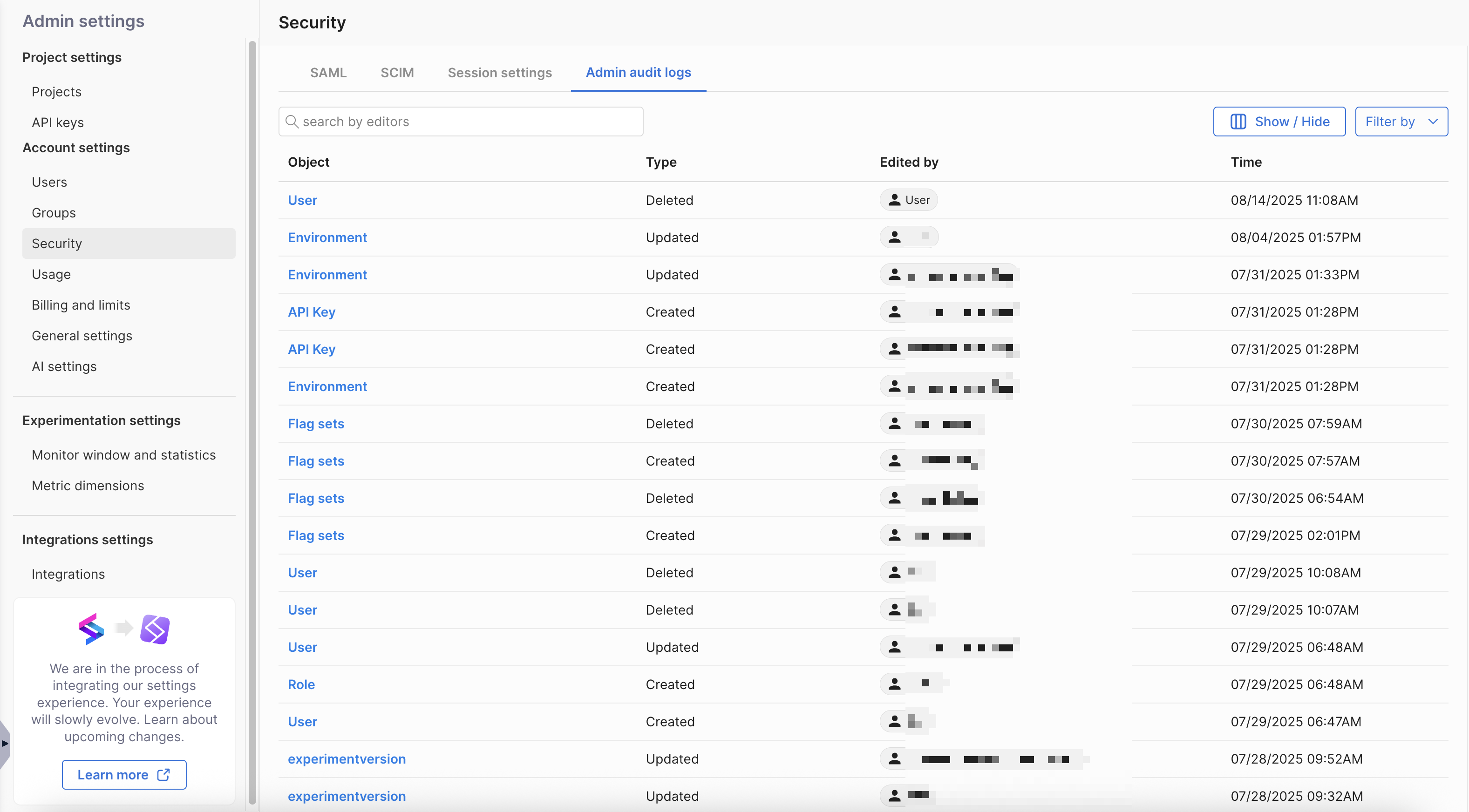 Monitor this data using the user interface to more easily audit every modification made to feature flags over time or to troubleshoot any issues that occur during rollout. You can also pull out this data via the outgoing webhook for analysis within other tools.
