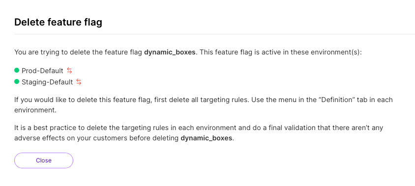 - After all targeting rules and definitions are removed from every environment, you should be able to successfully delete the feature flag from the UI.