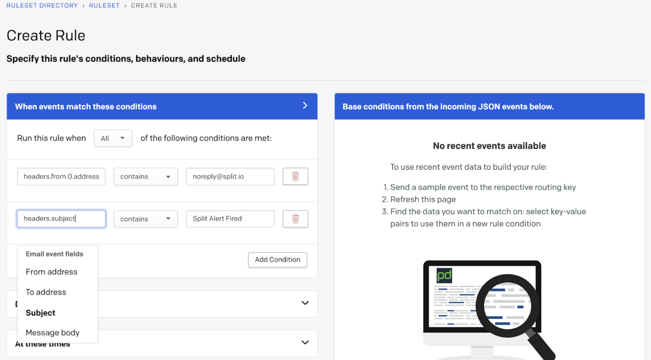 The actions performed by my rule are to route to an appropriate service -- “AB feature testing” -- set the severity to critical and label the incident with a note that “Split has detected a degradation in a key metric”. You can specify whatever action you think is most appropriate; PagerDuty is incredibly flexible in its response to the alerts.