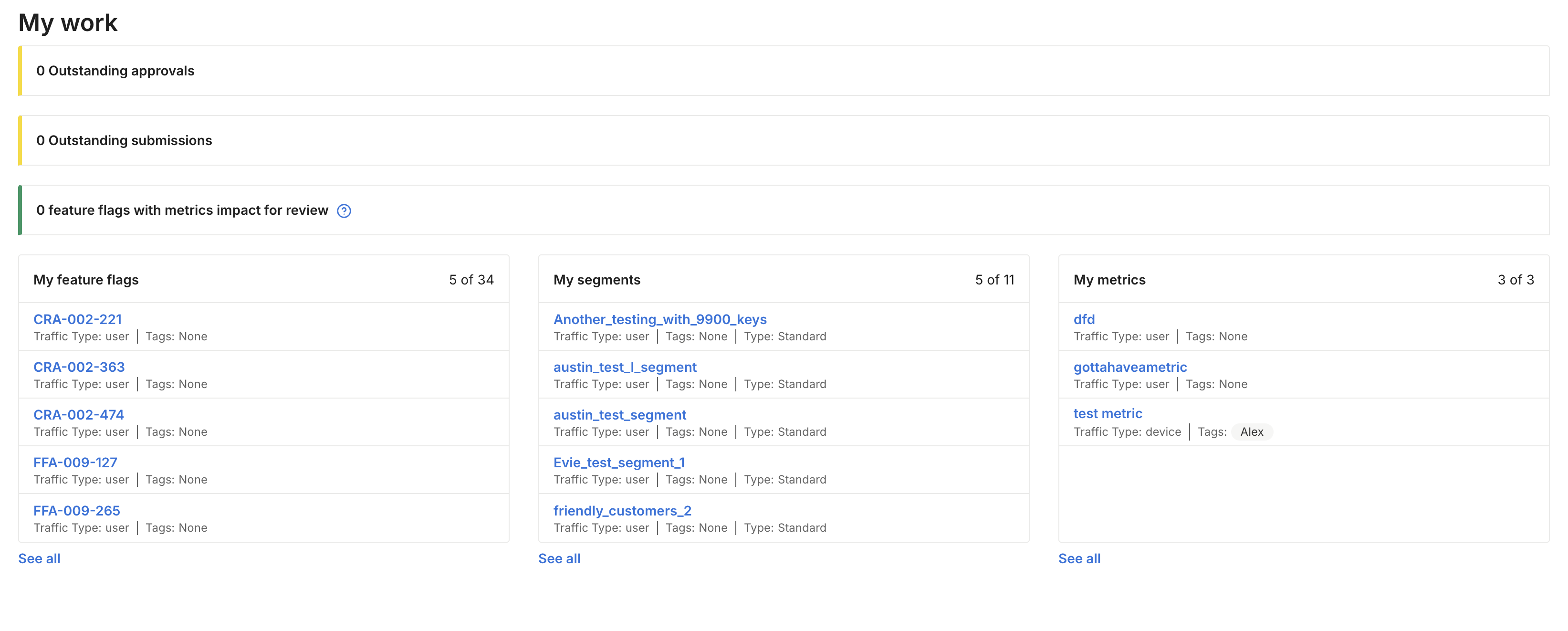 The My work page provides you a high-level view of any outstanding tasks to take care of within a feature flag as well as a view of any feature flags, segments, and metrics that you own.