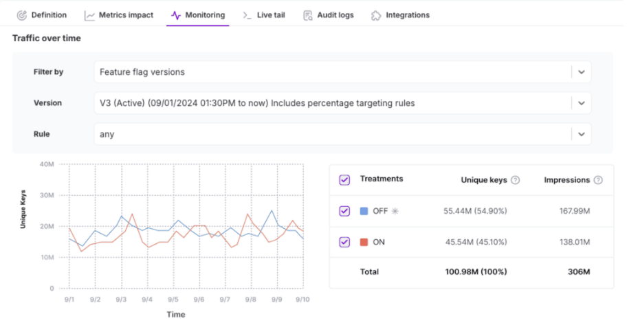 This section visualizes the number of unique keys (users, accounts, or your defined traffic type) served each treatment over the selected time period. The data is shown in a line graph, with each line corresponding to a selected treatment. If a time range is selected that spans across versions, vertical lines indicate when a new feature flag version was created.