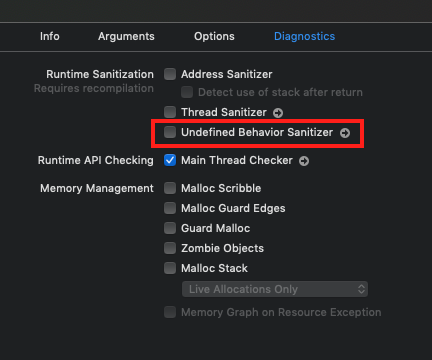 - Disable the Undefined Behavior Sanitizer flag by navigating to your target’s Edit Scheme > Diagnostics tab and unchecking the Undefined Behavior Sanitizer option.