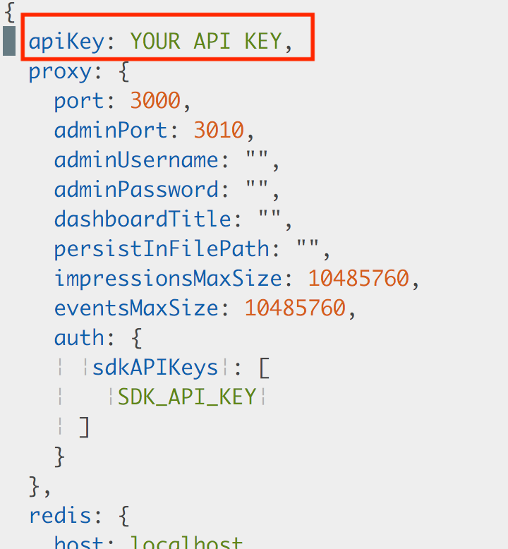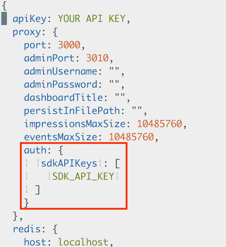 Proxy mode usage: When Synchronizer is used in proxy mode (not Redis), the "auth" section and "sdkAPIKeys" allow setting custom API keys for internal use, enabling SDKs to use the internal custom API key.
