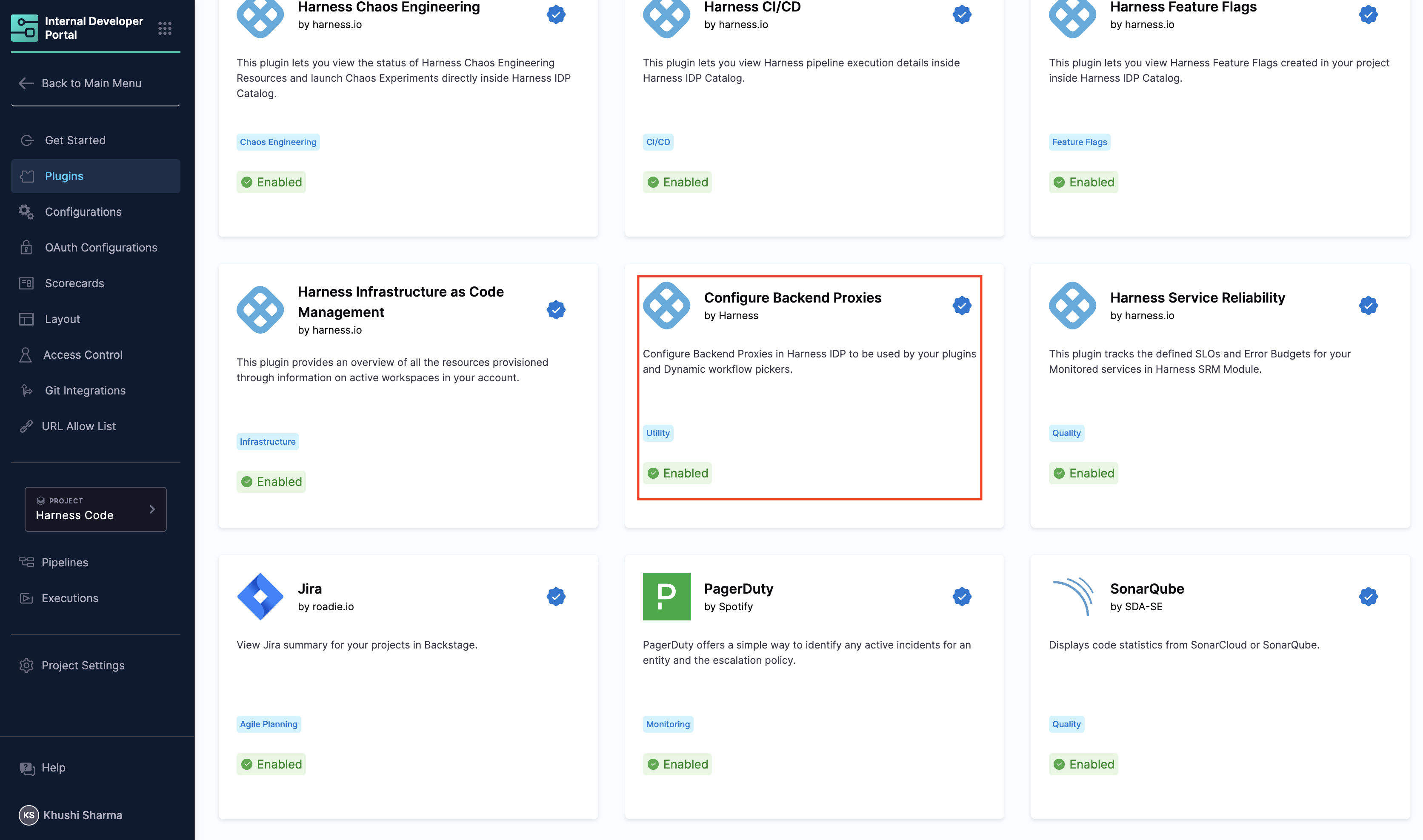 Under the "Plugins" page, search for "Configure Backend Proxies" by Harness IDP. Ensure this plugin is enabled.