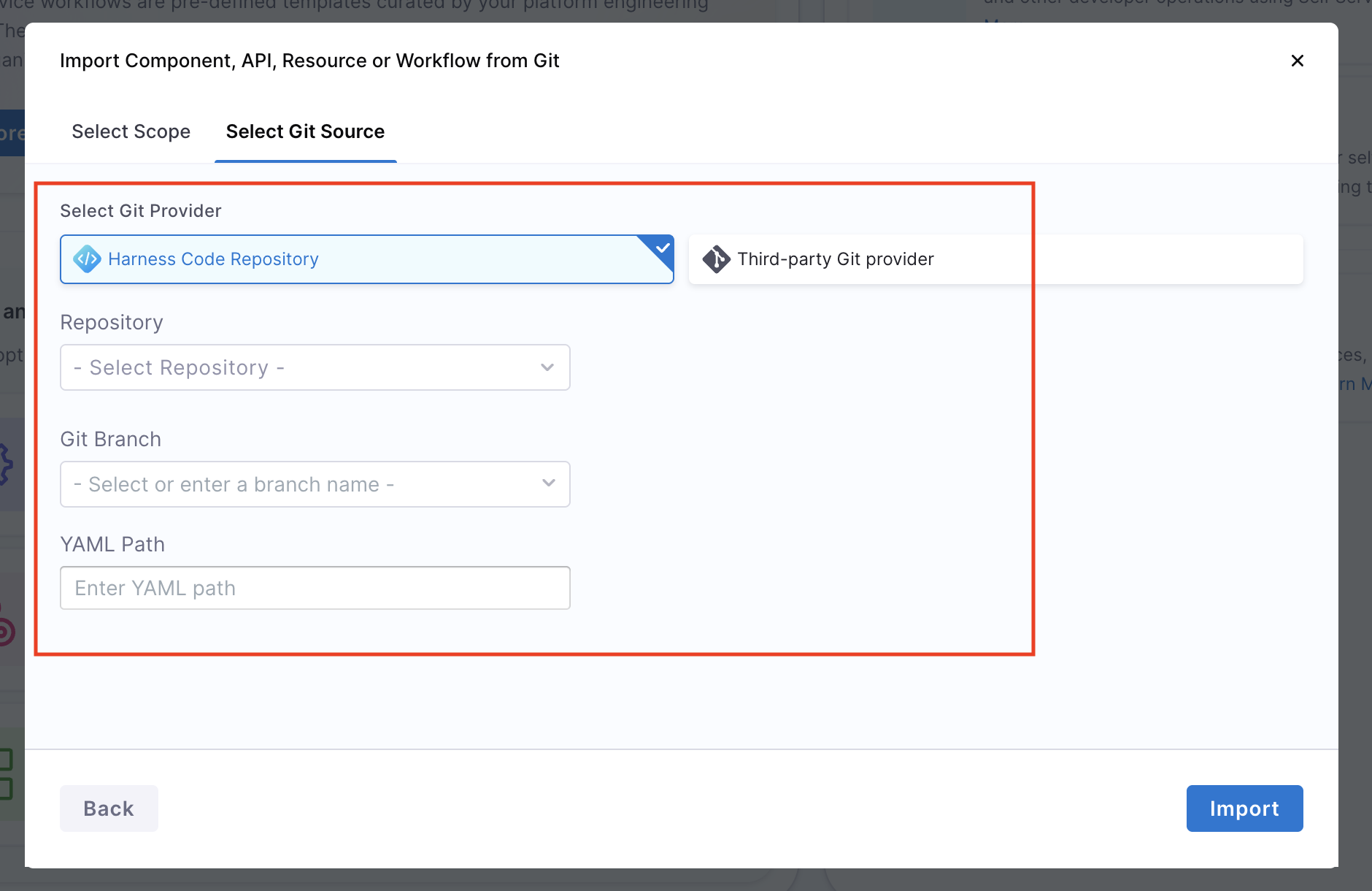 In Harness IDP, users can also create new entities and Workflows by importing their YAML definitions stored in Git repositories directly into Harness IDP. This feature allows teams to reuse pre-defined configurations, onboard services faster, and migrate from automation workflows or existing repositories.