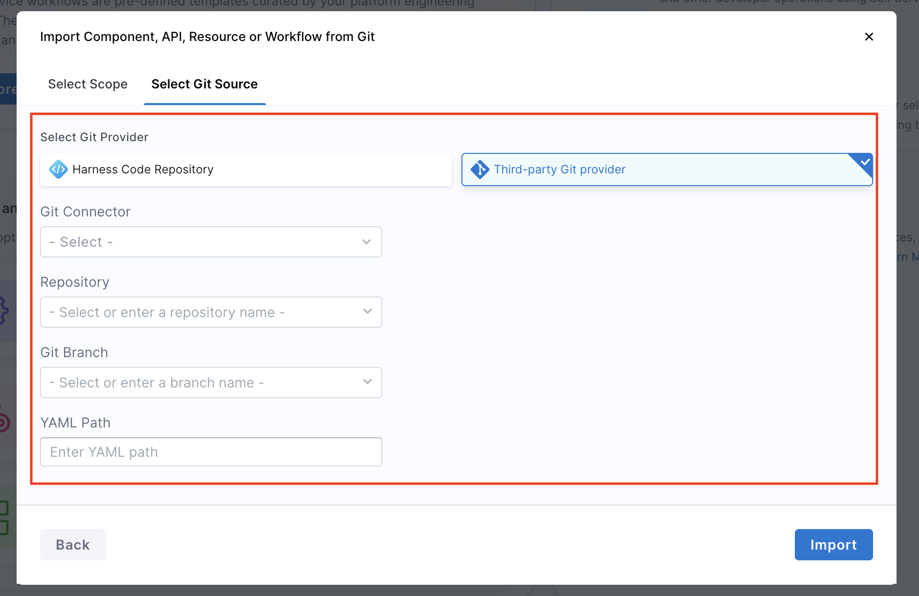 • Third-Party Git Providers: When using other Git providers (GitHub, GitLab, Bitbucket, Azure Repos), the same rules apply — the scope selection and YAML determines the entity's scope. The following details are required in importing an entity from Git using Third-party Git Providers: