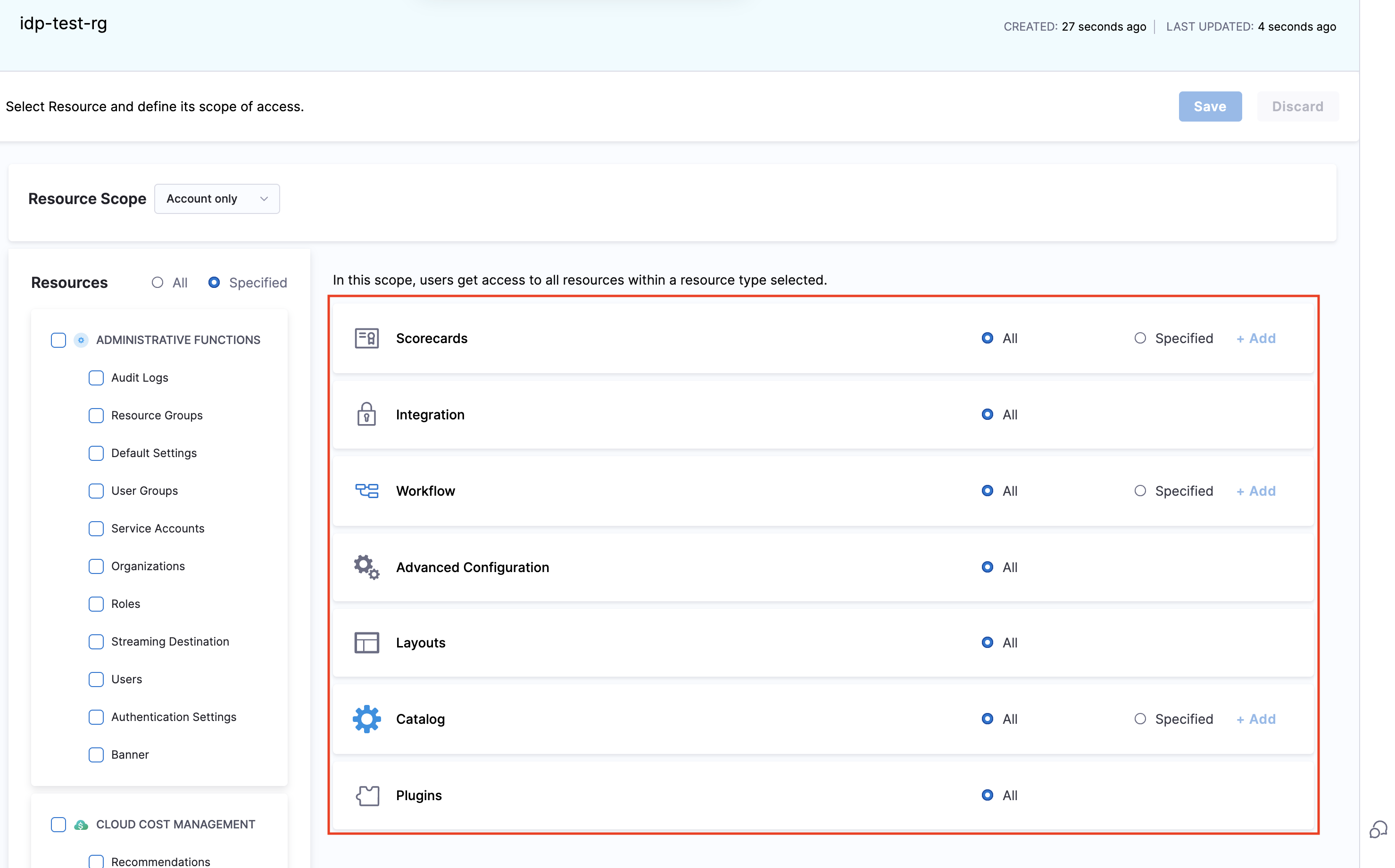 Note: If a resource group is created at the Project level, you cannot select Org or Account scopes for it. Learn more about Scopes and Refinement.