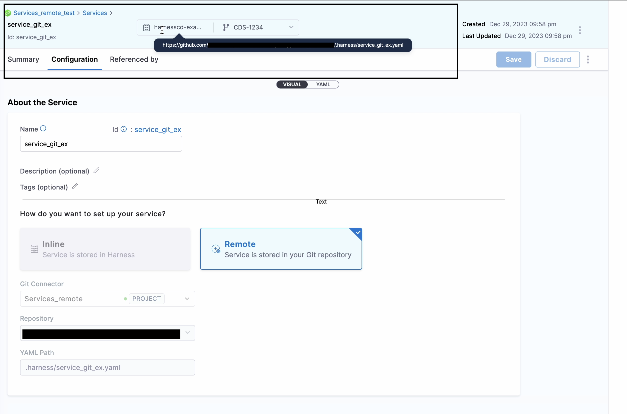 - Remote: the Harness service is stored in Git.