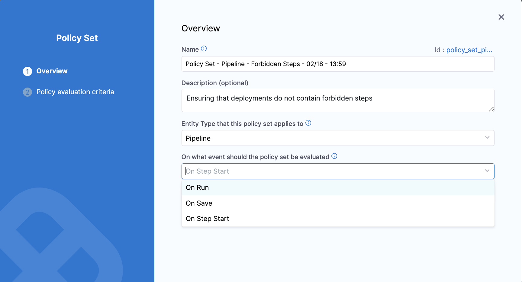 Policy Sets are stored to the Harness OPA server for a given entity type and event in Harness. The entity (Pipelines, etc) and event (On Save, On Run, etc) associated with a Policy Set determine when the policies in that set are evaluated.