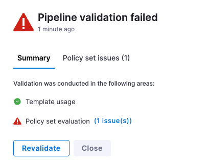 • Clicking on the flag will outline the policies that are in violation, and the direct issues can be further investigated. Once changes are made, there is also the ability to re-validate the pipeline