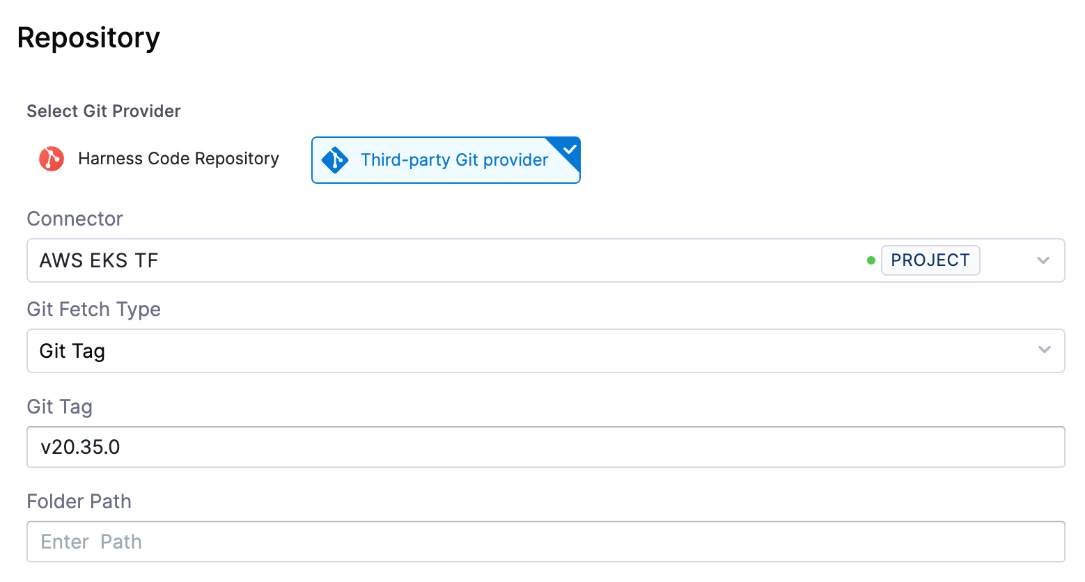 Then select Third-party Git Provider and select the connector we created for the source repository, fetch by tag and enter the latest tag we saw.