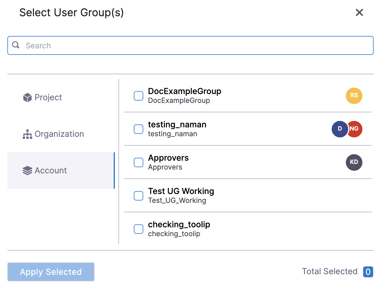 • To create a user group at the organization scope, go to Account Settings, select Organizations, select the relevant organization, and then select Access Control.