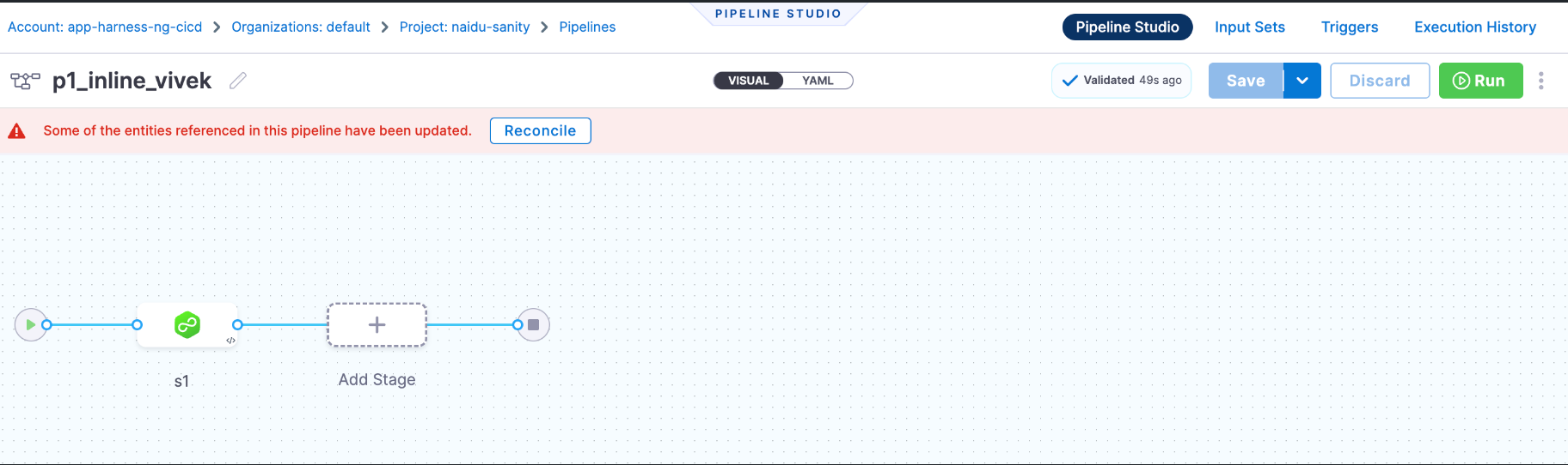 Harness warns you when a pipeline references a template that needs to be reconciled when you change it.