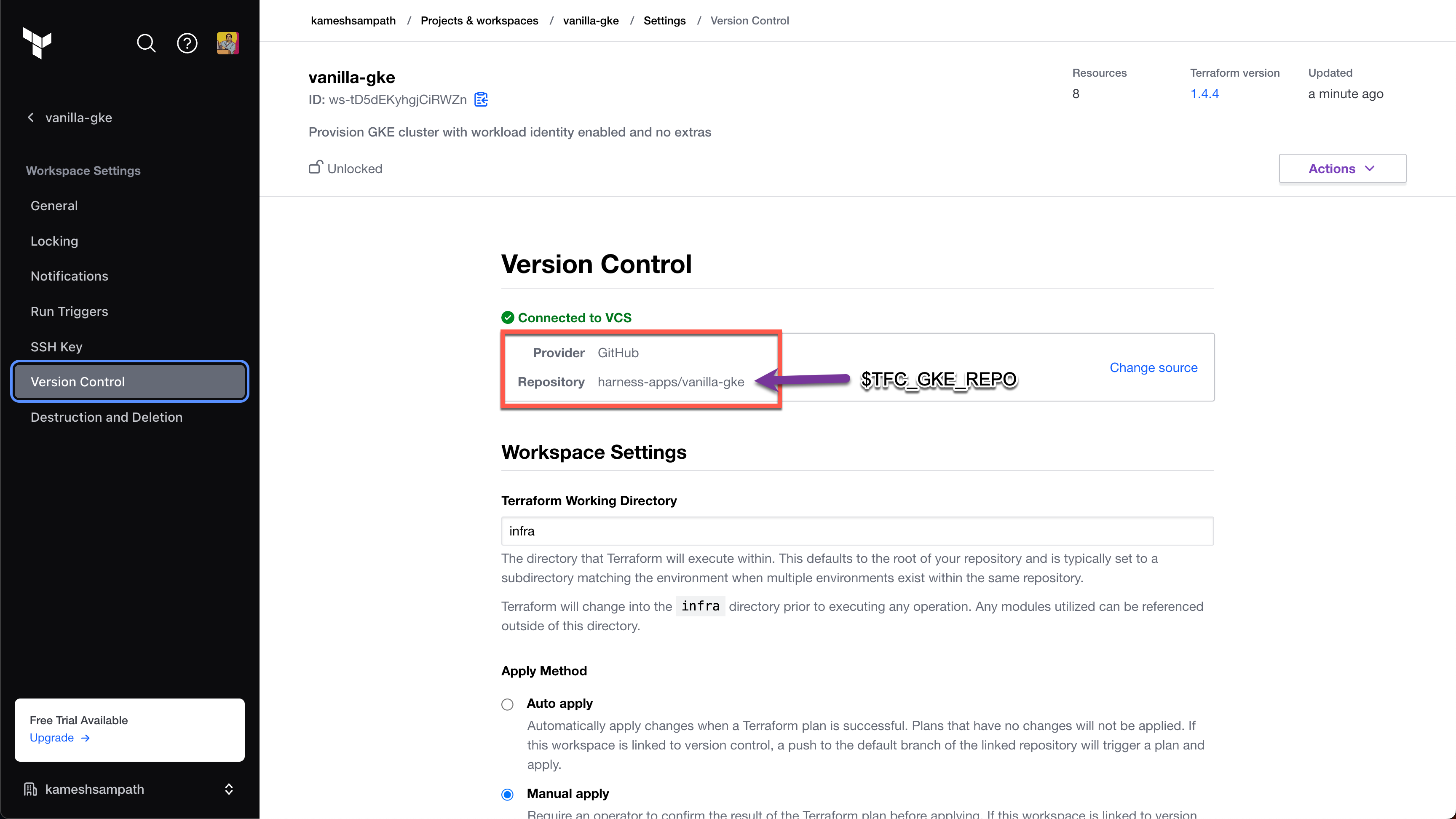 2. Update the workspace settings to use Version Control and point to $TFC_GKE_REPO, which is the vanilla-gke tutorial repo.