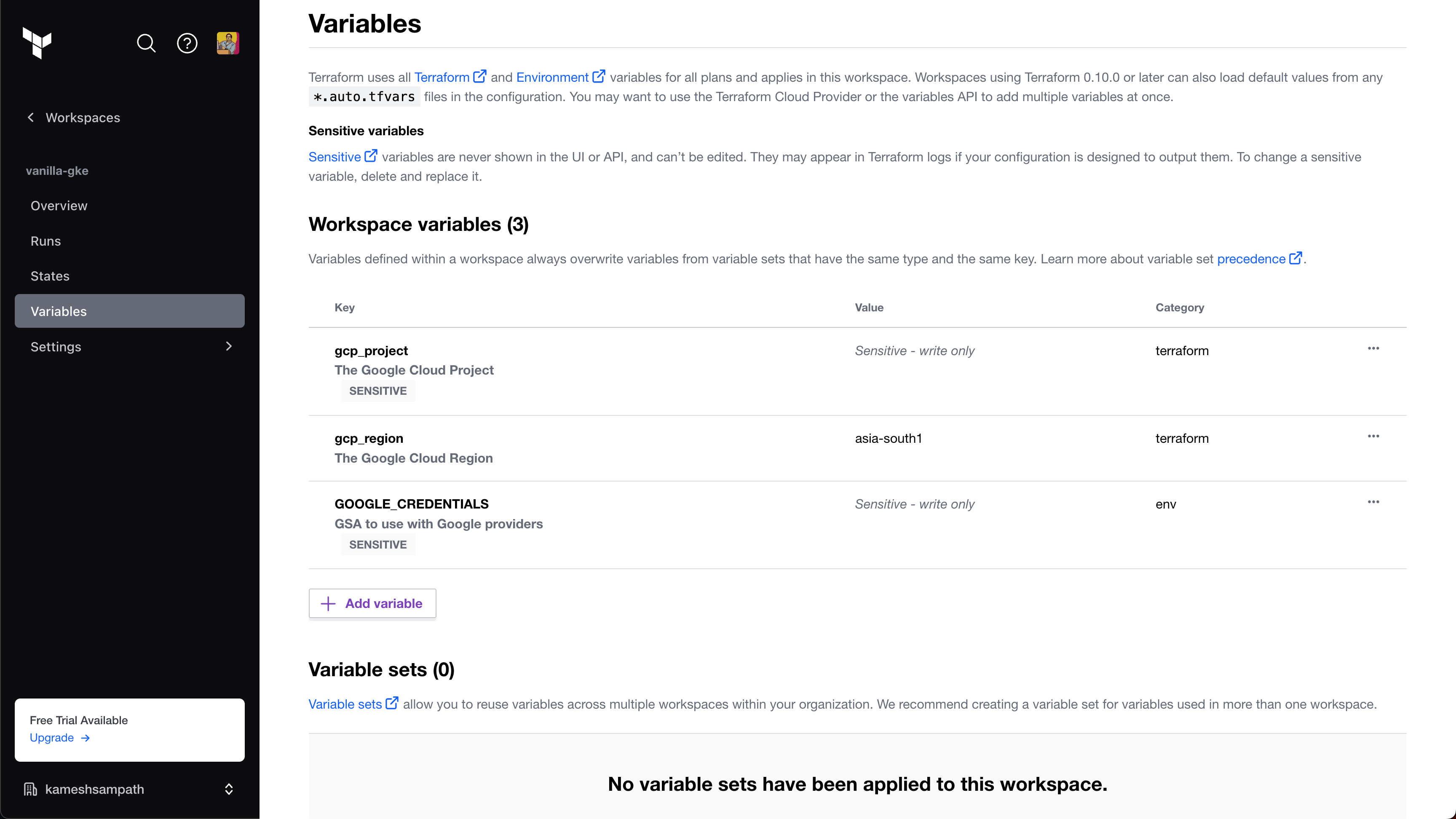 4. Create a variable called $TF_WORKSPACE and set the value to the name of your Terraform Cloud organization.