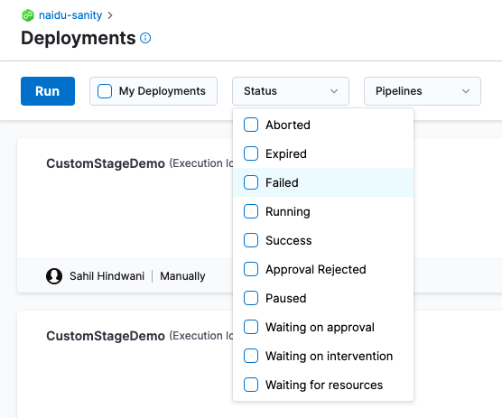 statusexpressions (such as<+pipeline.stages.STAGE_ID.status>) refer to the current running status of a single node, such as a pipeline, stage, or step. It provides information about the state of that specific node without considering the status of any parent, child, or sibling nodes. It reports the direct status of the target node. -