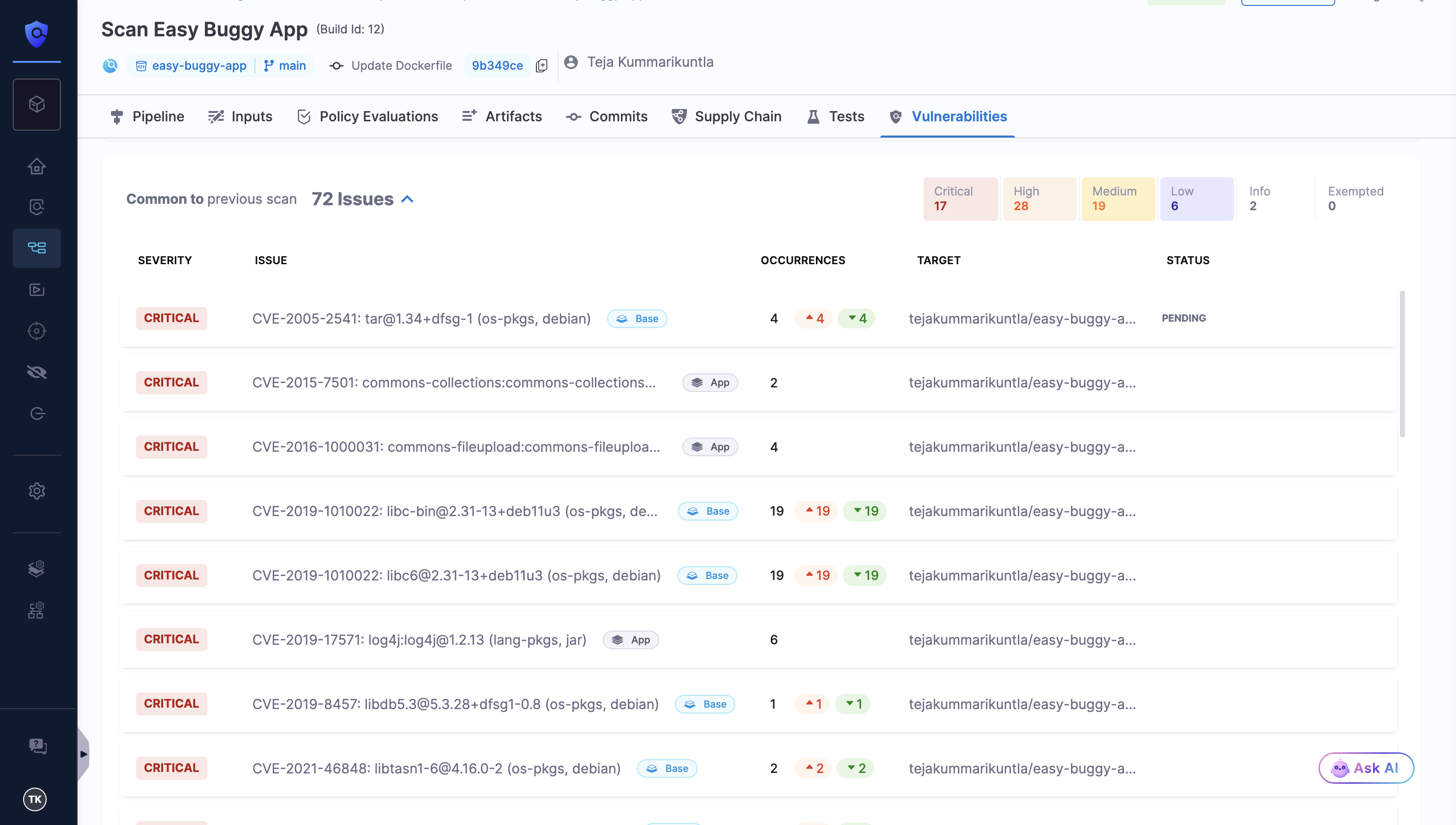 • Base: These are the vulnerabilities detected in the base image of your application.