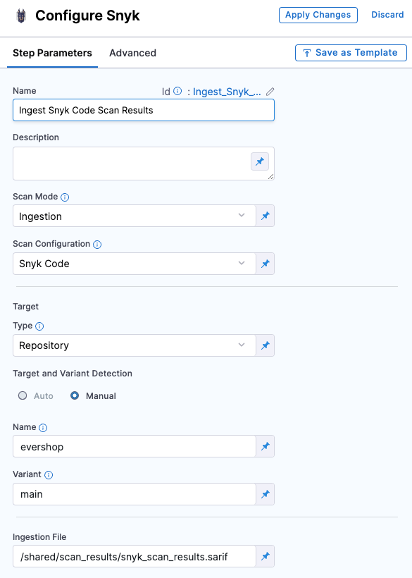 5. In the Ingestion File field, enter /shared/scan_results/snyk_scan_results.sarif.