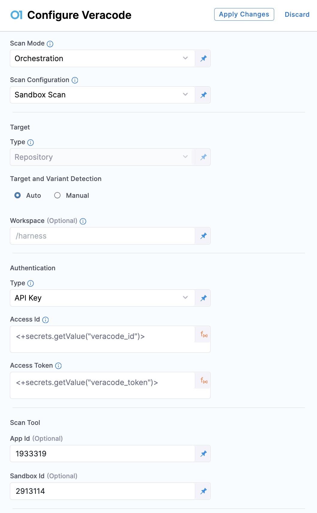- App Id(optional): In the Scan Tool section, you can provide the Veracode App Id of the application from which you want to fetch scan results. If left blank, the step will try to locate an application using the Target Name you specified. Note that the step can only find applications previously created by STO during orchestration, as it relies on the specific naming convention used by STO. Additionally, refer to this section to learn more on how to use an existing Veracode Application created by STO.