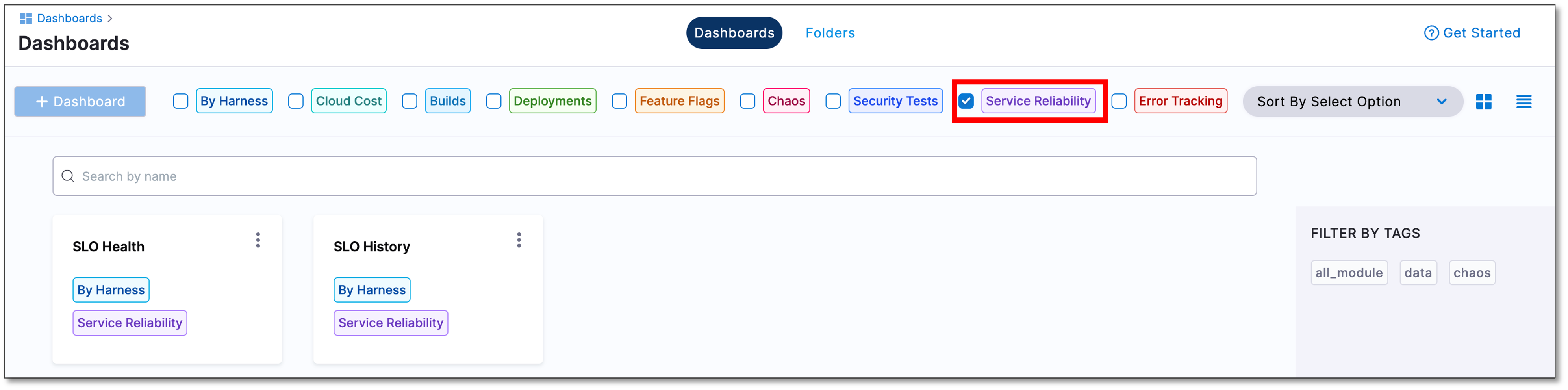The dashboard list is displayed, which includes the following pre-configured Service Reliability dashboards: