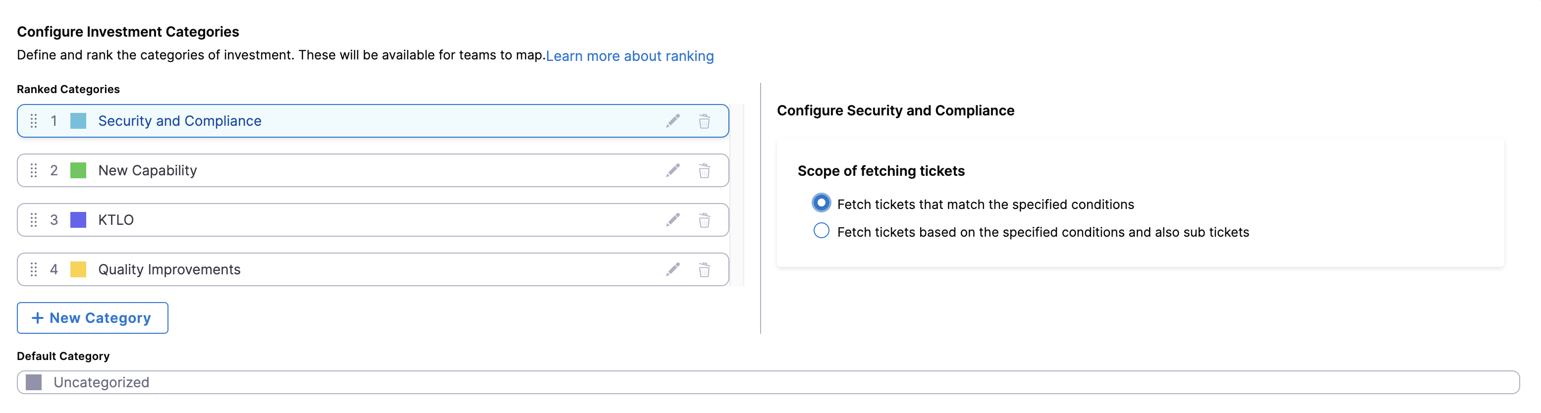 Each Investment Category in the Business Alignment profile defines how tickets should be fetched based on specific criteria and hierarchy rules. This ensures that effort is correctly attributed even in nested work structures like epics, stories, and sub-tasks.
