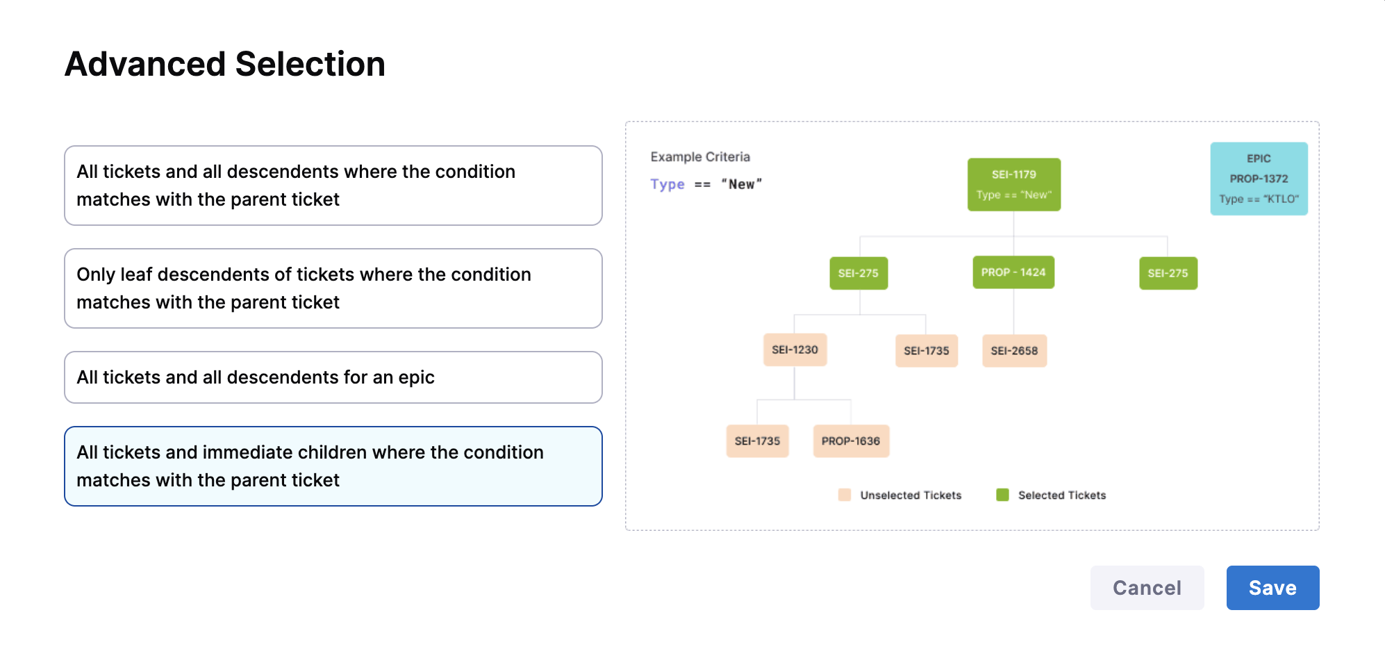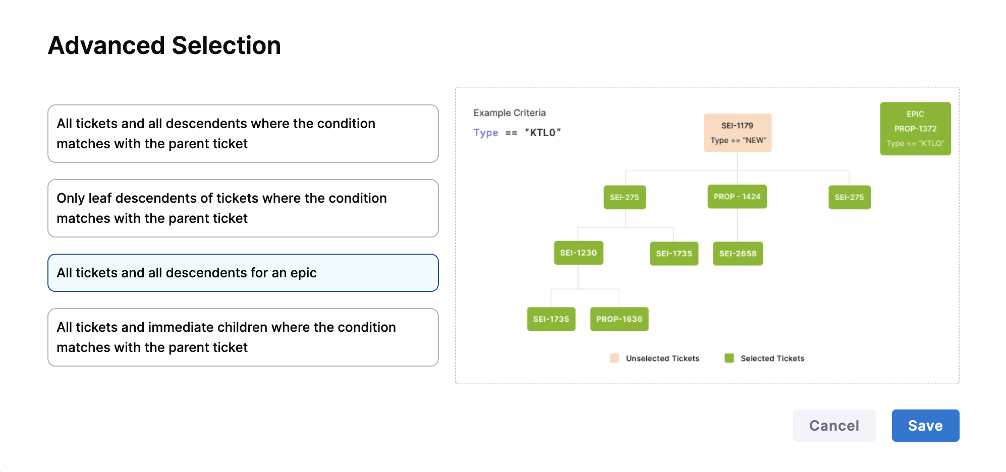 All tickets and all descendents where the condition matches with the parent ticket: Includes the parent ticket and all levels of child tickets (e.g., epics to stories to sub-tasks).