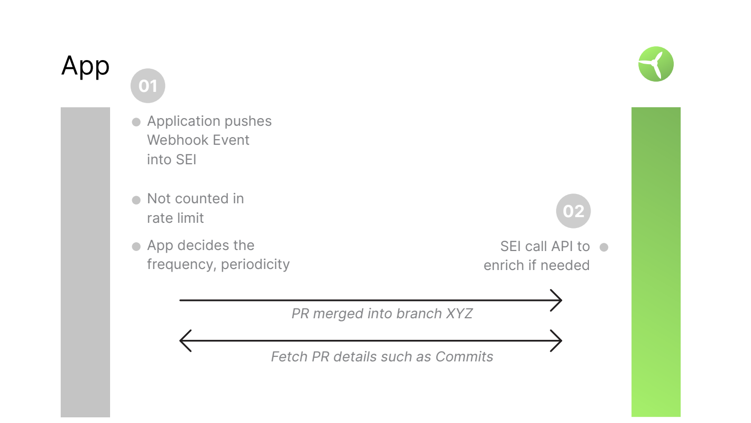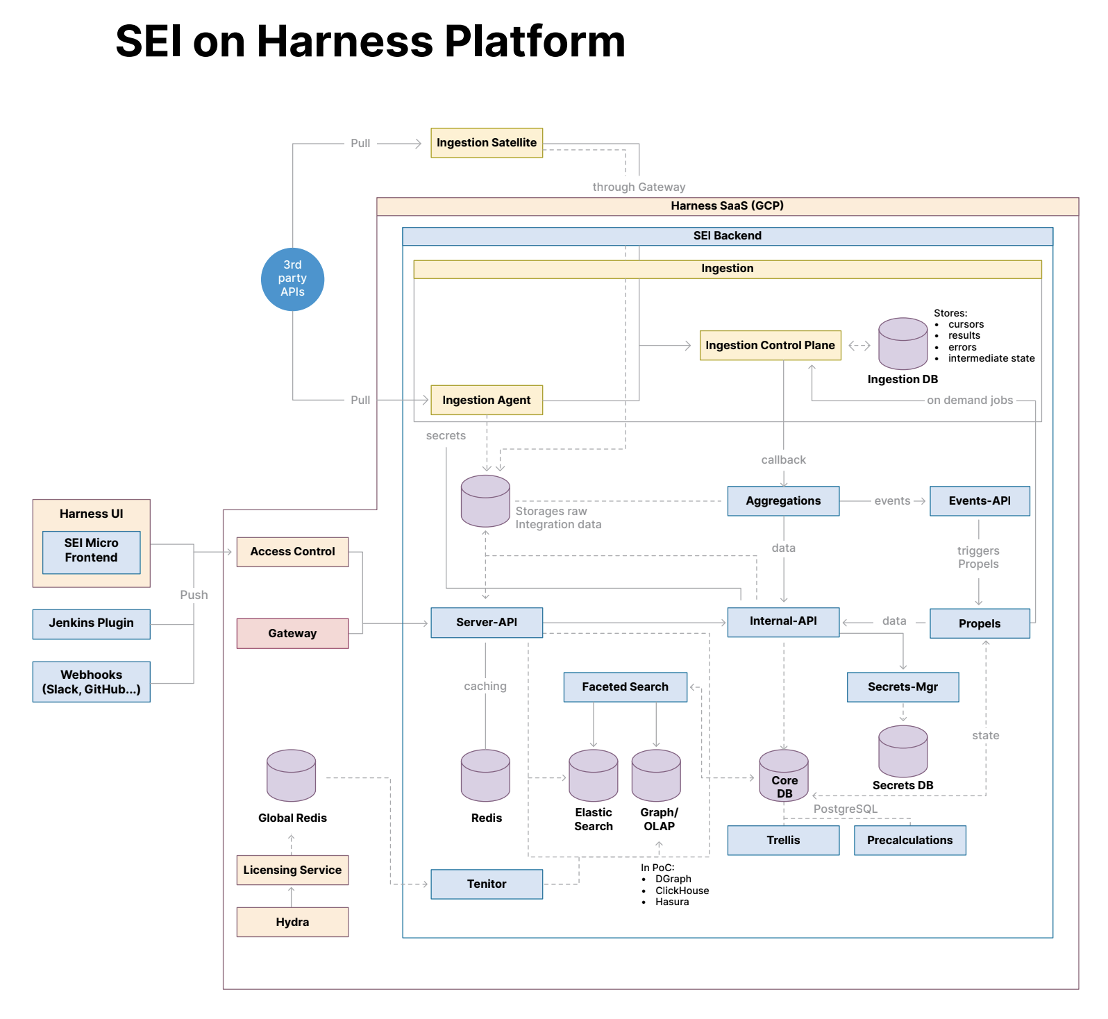 The frontend for users is powered by a micro-frontend architecture that interacts with the backend services via the Access Control and Gateway. Integration with tools like Slack or GitHub is handled via webhooks, which push real-time updates into the SEI system. Ingested data flows through various components, including aggregation services, storage systems, and search mechanisms. Insights and results are then made available to the frontend via APIs and are cached to improve performance.