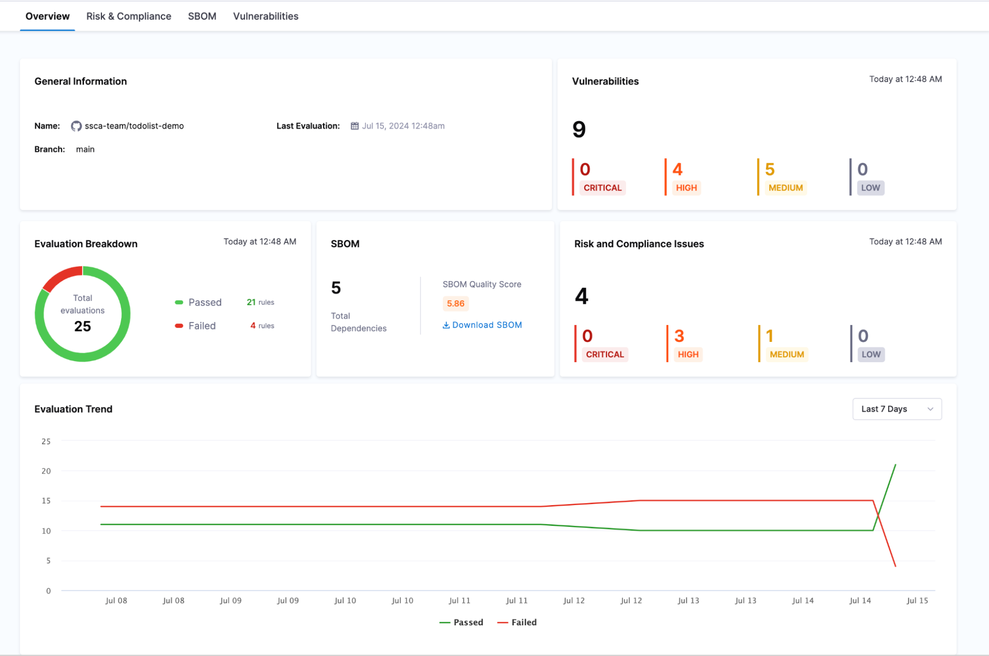 • Evaluation Trend: This graph presents the trend of evaluations over time, showing the number of rules passing and failing with respect to the date. This helps users visualize the improvement or decline in the security posture of their repositories.