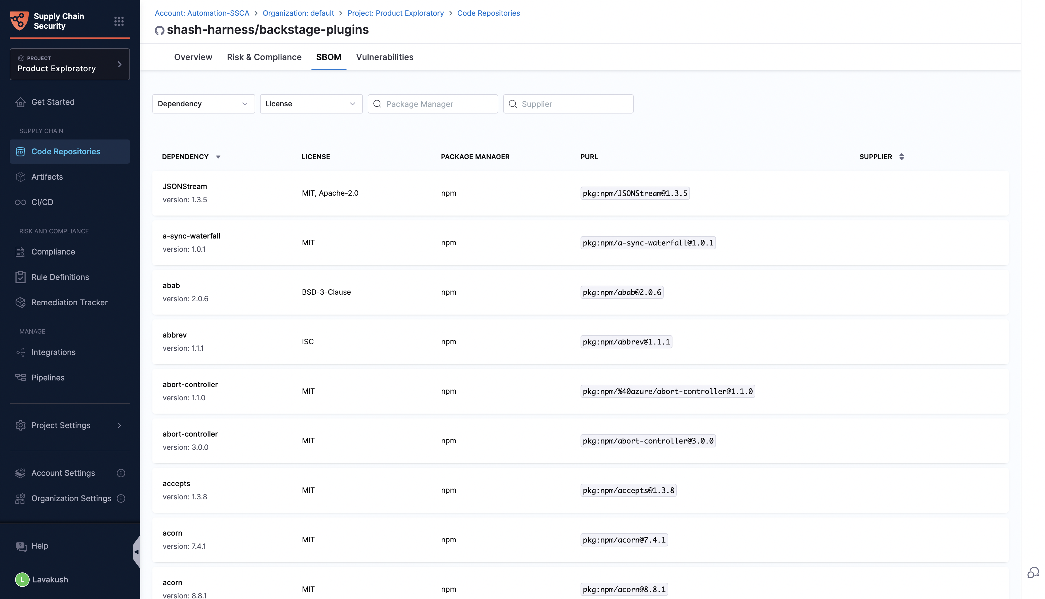 The SBOM section presents a comprehensive list of all the repository dependencies. Detailed information is provided for each dependency, including the name, version, license, package manager, PURL (Package URL), and supplier.