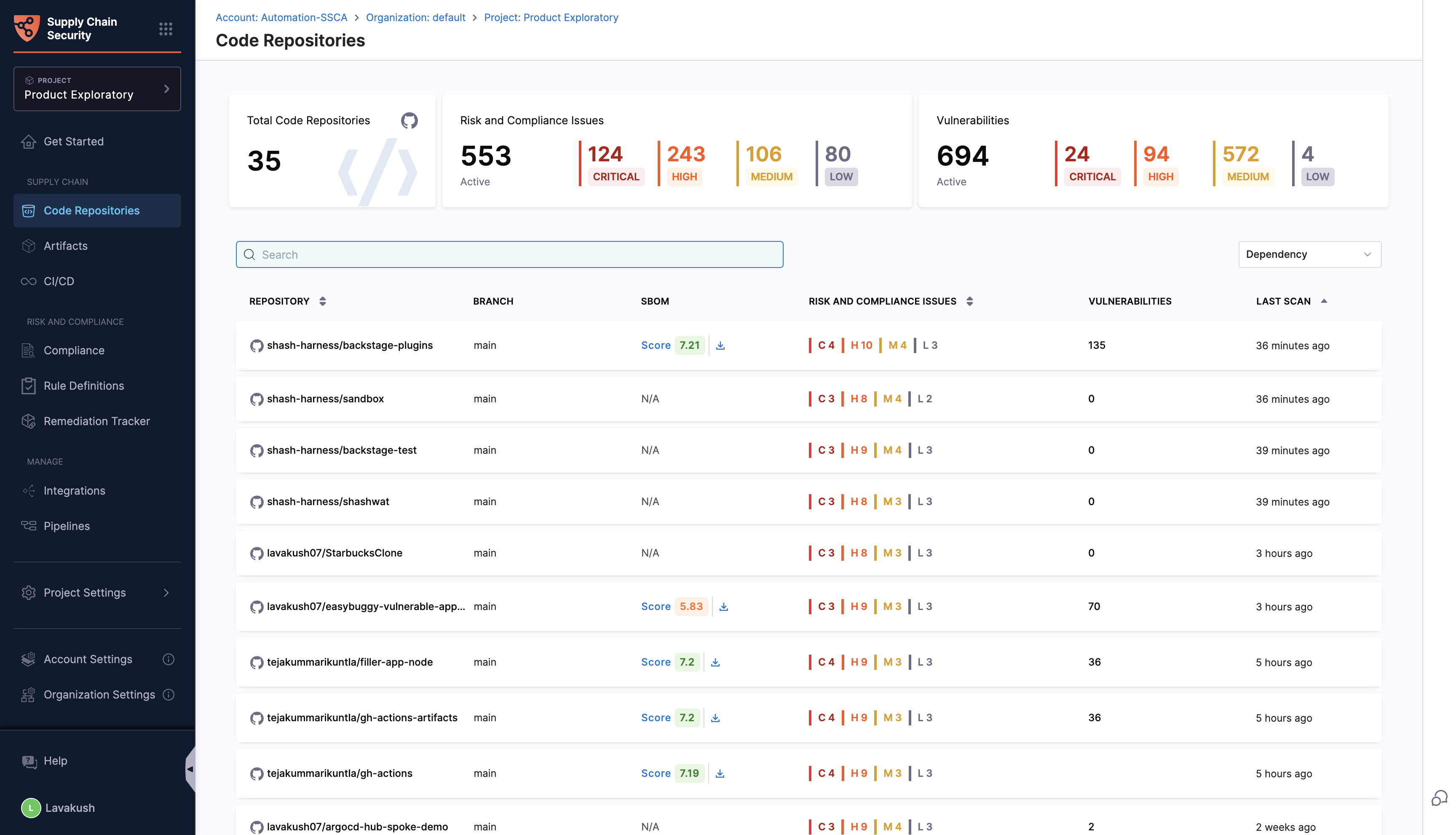 Additionally, it reveals details of security vulnerabilities through security scanning. Also, it provides an in-depth look into the composition of the repository by generating the Software Bill of Materials (SBOM) and its quality score. This helps users understand their repositories' security posture and manage them effectively to avoid potential supply chain attacks originating from code repositories and their organizational settings.