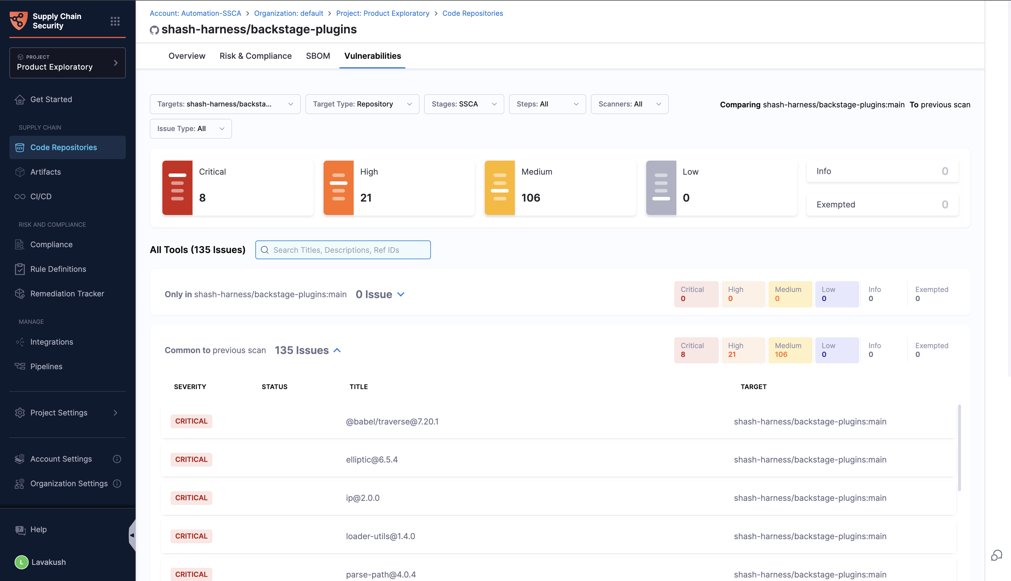 Understanding the security and risk posture of your code repositories is crucial for maintaining a secure development environment and preventing supply chain attacks. This section provides a comprehensive overview of the security and risk posture by presenting detailed insights into various aspects of your repositories. It highlights all the issues related to risk and compliance derived from the code repository configurations generated by applying industry-standard software supply chain benchmarks such as CIS, OWASP Top 10 CI/CD Security Risks etc.
