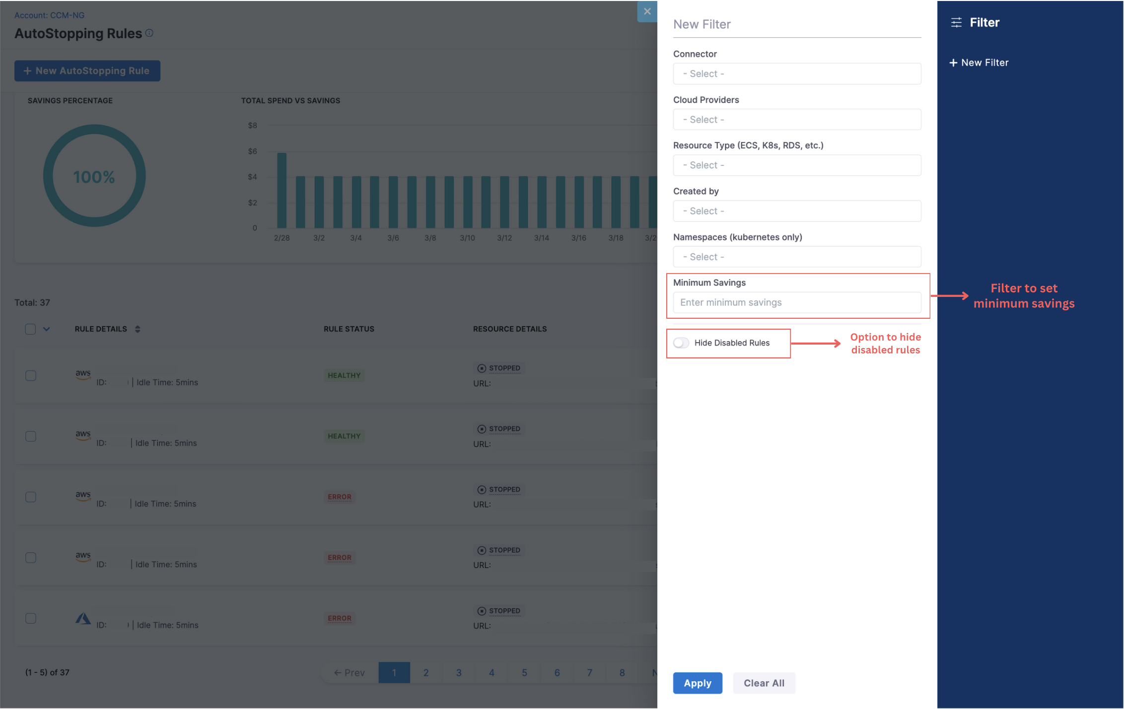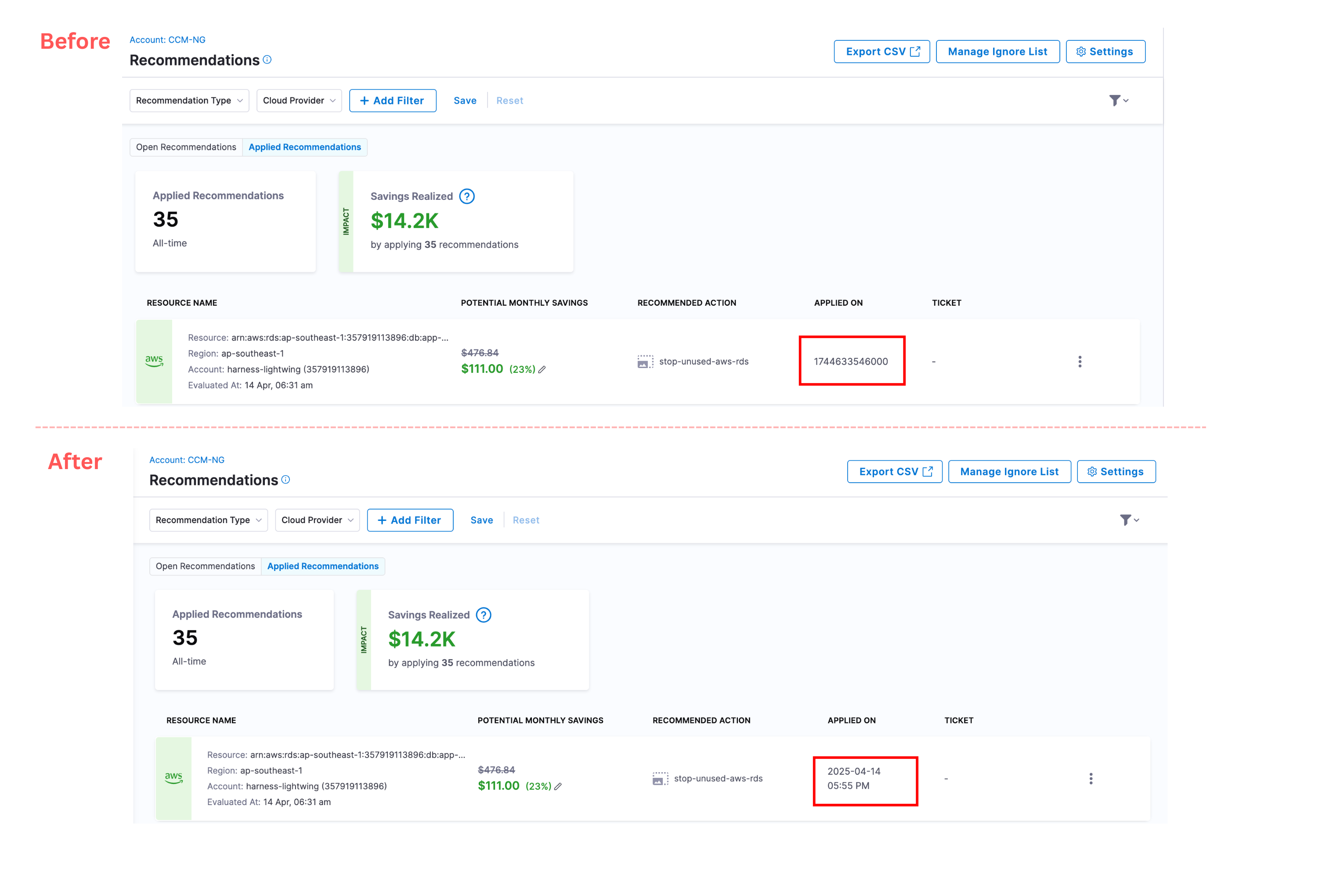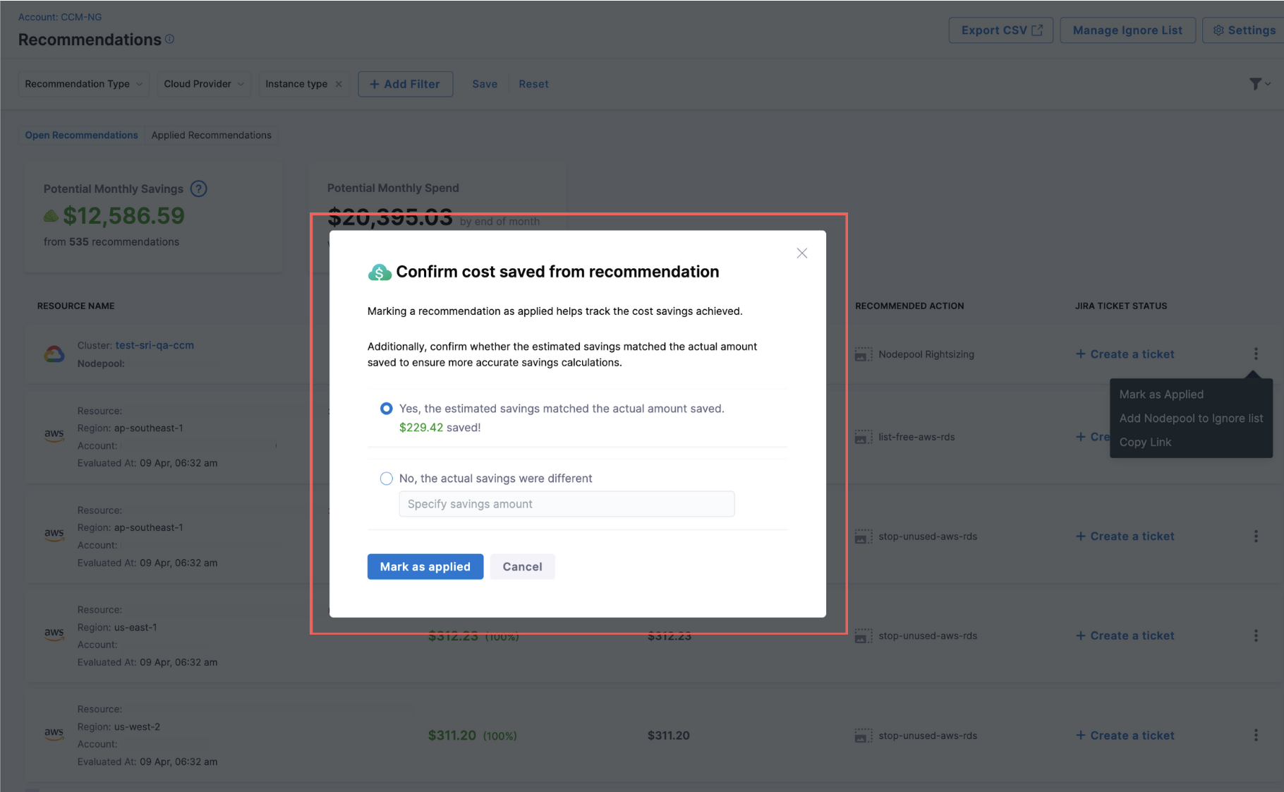 • Realized Savings from Governance Enforcements: We’ve added support for showing realized savings for enforcements. On both the enforcement list page and the enforcement details page, monthly savings will now be displayed for non–dry run enforcements. [CCM-27472]